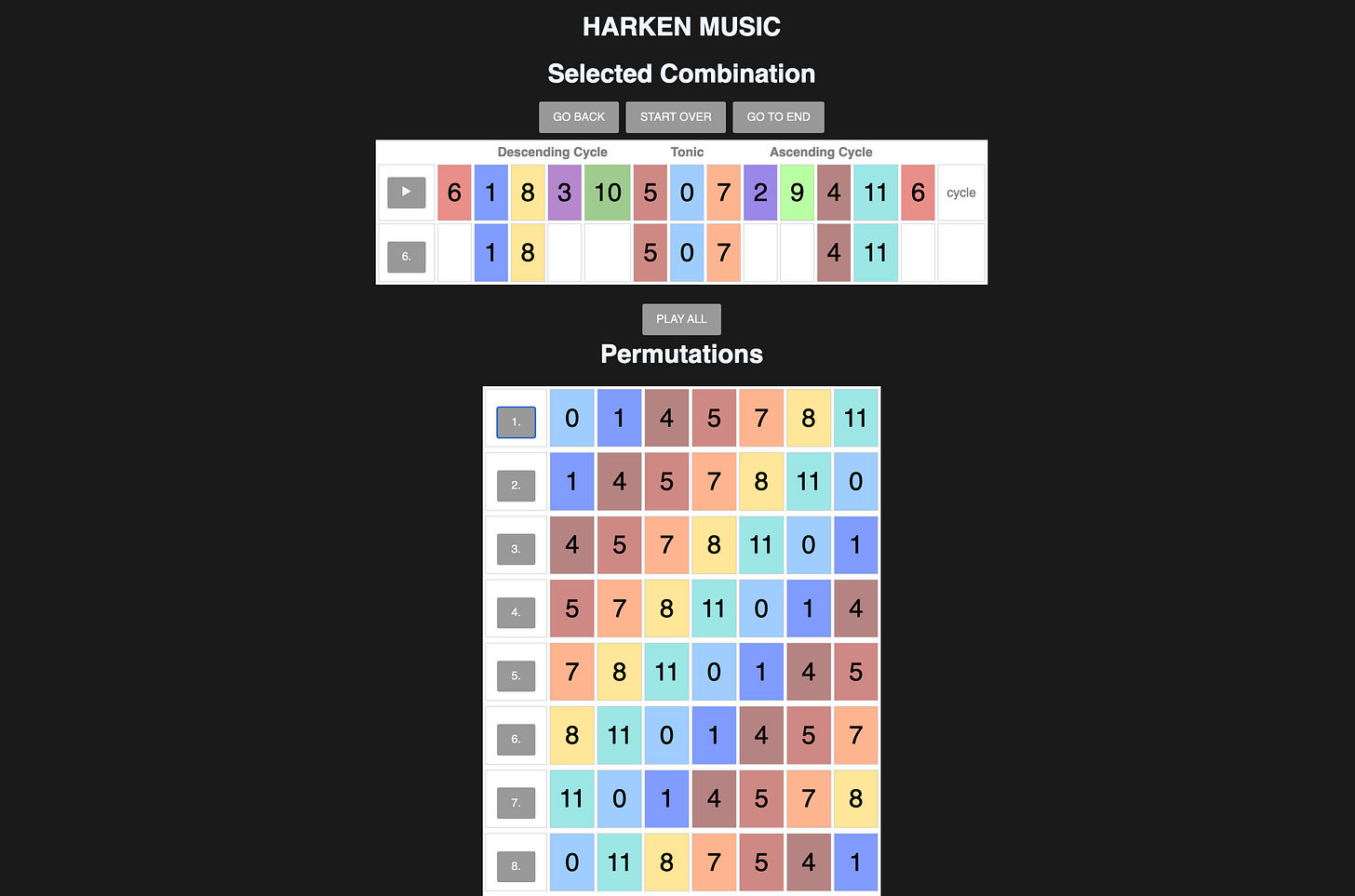 Please try our free open-source demo* at harkenmusic.com, where you can choose any combination size (from 1 to 12 notes) from the pull-down menu; then select any particular combination from the numbered list, to see and hear all permutations, reflections (inversions), and rotations (transpositions).
